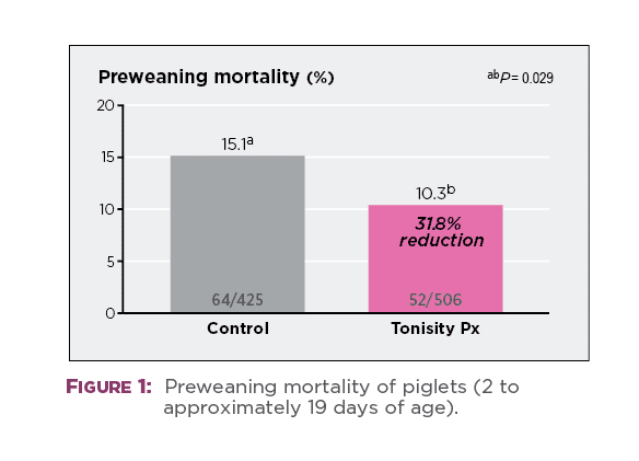 >Preweaning mortality fell 31.8% (P = 0.029) for piglets that received Tonisity Px for 7 days beginning at 2 days of age, and odds of survival were 1.55-times higher for supplemented piglets compared to controls.