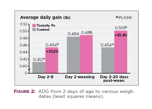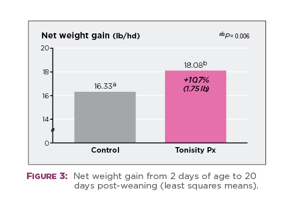 >Piglets supplemented with Tonisity Px also grew faster than controls, improving ADG and net weight gain by more than 10% (P ≤ 0.015) vs controls from 2 days of age through 20 days post-weaning.