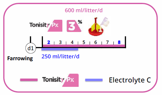 A field study (Study 24-017-P-P) carried out on a commercial farm in France evaluated 2,407 piglets, distributed across 156 litters, comparing Tonisity Px with a conventional electrolyte (Electrolyte C). Both products were administered according to their respective labels and to the farm’s standard management practices.