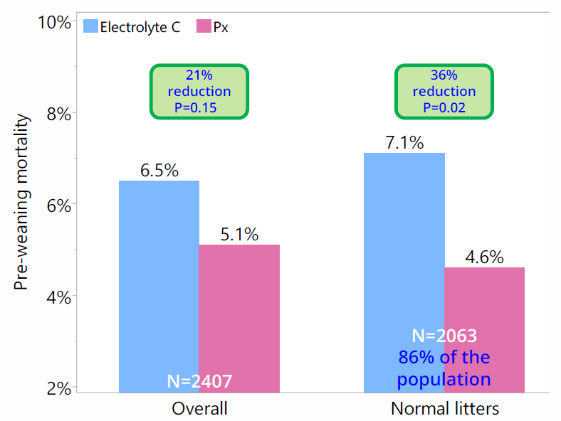 Piglets receiving Tonisity Px experienced a 21% reduction in overall pre-weaning mortality compared with those given Electrolyte C.