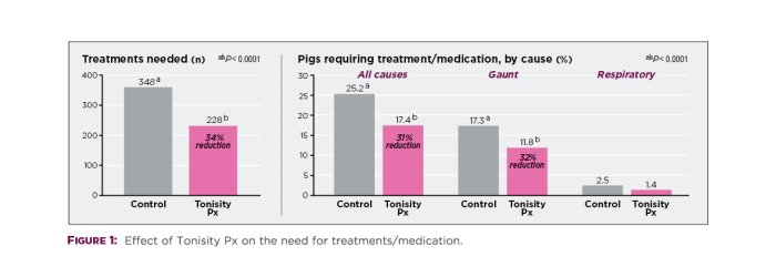 >Piglets that received Tonisity Px during a 6-day peri-weaning period required 34% fewer medical treatments in the nursery and improved 6-week post-weaning growth rate 3.9%.