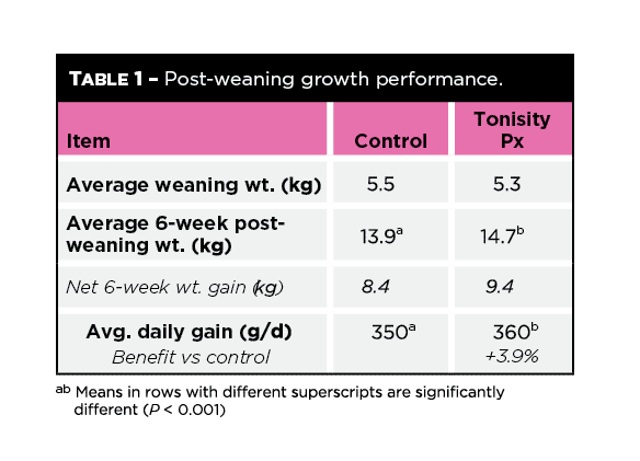 Pigs supplemented with Tonisity Px also demonstrated significantly (P < 0.001) heavier BW than controls by 6 weeks after weaning (Table 1), and averaged 0.8 kg (5.9%) more net weight gain/head. Thus, post-weaning ADG improved 3.9% (P < 0.001) during the 6-week post-supplementation period.