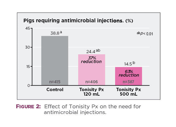A linear dose response to Tonisity Px was clearly evident in this study for both antimicrobial usage and weight gains of piglets. The largest benefits were observed for sows receiving 500 mL/day of Tonisity Px vs controls, while responses were intermediate for sows receiving just 120 mL/day.