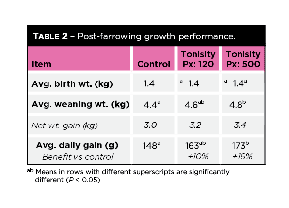 In addition to morbidity reductions in the 500-mL Tonisity Px group, improved rates of growth were also observed (Table 2). Piglets from sows supplemented with 500 mL of Tonisity Px generated significant (P < 0.05) improvements in both weaning weight (9%, +400 g) and ADG (16%), while the 120-mL dose rate of Tonisity Px provided numerical improvements but did not achieve significance (P > 0.05).