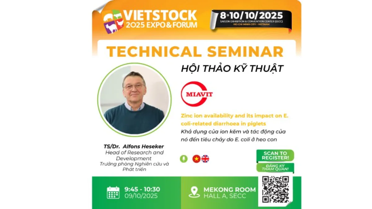 Hội thảo kỹ thuật: Khả dụng của ion kẽm và tác động của nó đến tiêu chảy do E. coli ở heo conTiêu chảy sau cai sữa là một thách thức lớn trong chăn nuôi heo, thường do vi khuẩn E. coli lợi dụng niêm mạc ruột chưa trưởng thành trong giai đoạn heo con bị căng thẳng. Điều này dẫn đến việc sản sinh độc tố và gây bệnh. Các ion kẽm tự do hỗ trợ sự phát triển của ruột bằng cách giảm tính thấm của niêm mạc, hạn chế vi khuẩn bám dính và cải thiện khả năng hấp thụ dinh dưỡng. Hiểu rõ cơ chế này là chìa khóa để nâng cao sức khỏe và hiệu suất của heo con.