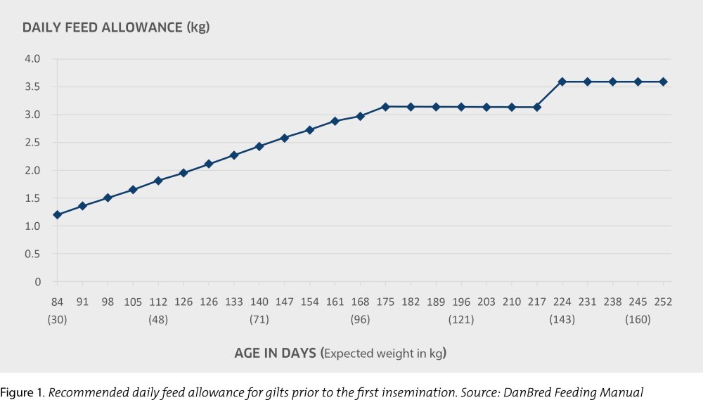A daily weight gain of 750 to 800g is the recommended optimum for gilts from a weight of 30kg and up to 140kg prior to insemination. While ad libitum feeding is unproblematic in gilts up to 60kg, feed intake should be limited from then on to obtain the necessary weight gain control (figure 1). If ad libitum feeding is the only option, however farmers should adjust the feed by lowering the protein content and raising the level of fibre.