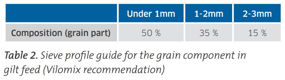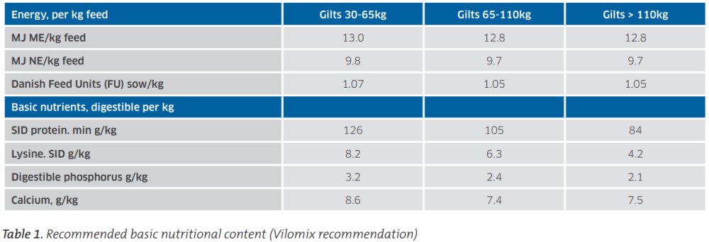 At each stage, the best gilt diet is the outcome of multiple considerations, regarding, for example, energy and digestible protein levels, raw material quality, fibre sources and degree of grinding. Accurate addition of minerals and vitamins ensures good bone development and general health. The feed table in figure 2 gives an overview of the recommended feed composition.