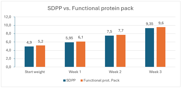 The test diet contained 5% SDPP vs. and alternative functional protein pack. Protein, energy, SID amino acids were all similar in both diets. The first round of 1,200 piglets was conducted in November and December 2025, and the second round of 1,200 piglets was finalized in February 2026. During the trial DLWG was measured in both groups and feedback from the farmer is that survival rate, use of medication and feaces score was similar in the two groups in both rounds.