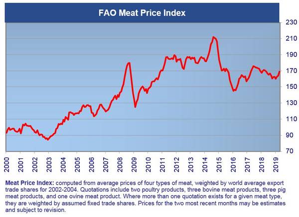 International price quotations of pig meat rose sharply due to a surge in import demand in Asia, primarily in China, caused by a sharp fall in the country’s pig meat production associated with the rapid spread of the African Swine Fever. Bovine, poultry and ovine meat prices all firmed reflecting an overall tightening of global meat markets.