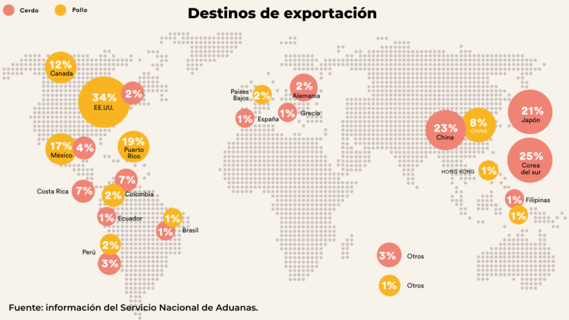 In the global market, the commercial success of Chilean pork is supported by its strong positioning in Asia. The main export destinations in 2025 were Chine (34%), South Korea (25%), and Japan (12%), in contrast to poultry, whose exports were concentrated in North America and the Caribbean, with the United States (21%), Puerto Rico (10%), and Mexico (17%) as key markets.