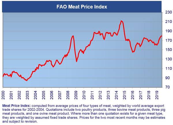 The FAO Meat Price Index averaged 179.8 points in August, up 0.5 percent (nearly 1 point) from its revised value for July, continuing the trend of moderate month-on-month price increases shown since February. With the latest increase, the index value stands 12.3 percent above its level in January 2019 and 7.8 percent above the corresponding month last year. In August, price quotations for pigmeat strengthened further, underpinned by a strong import demand from Asia, principally China, where the African Swine Fever (ASF) continued to limit domestic pigmeat production. Despite strong import demand, poultry and ovine meat price quotations remained steady, reflecting increased export availabilities from the main producing regions. While international trade in bovine meat remained robust, its price quotations denominated in USD declined marginally, reflecting the weakening of national currencies of some large exporting countries, including Australia.