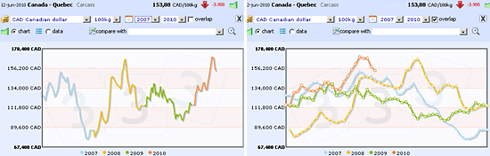 We have added some more pig prices from America: Canada (Quebec and Ontario) and USA (Iowa-Minnesotta) and, in order to present the information in a clearer format we have grouped the countries by continent