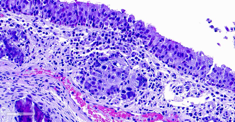 Inclusion body rhinitis (IBR) is caused by porcine cytomegalovirus (PCMV). This disease was originally named “inclusion body rhinitis” based on the histopathological characteristics of the disease. These animals exhibit basophilic intranuclear inclusion bodies primarily in the submucosal glands, although such inclusions can also be found in other tissues. Even though PCMV is widespread and highly prevalent in swine populations, its impact on the swine industry remains poorly defined and is often underestimated, partly due to potential interactions with other pathogens.