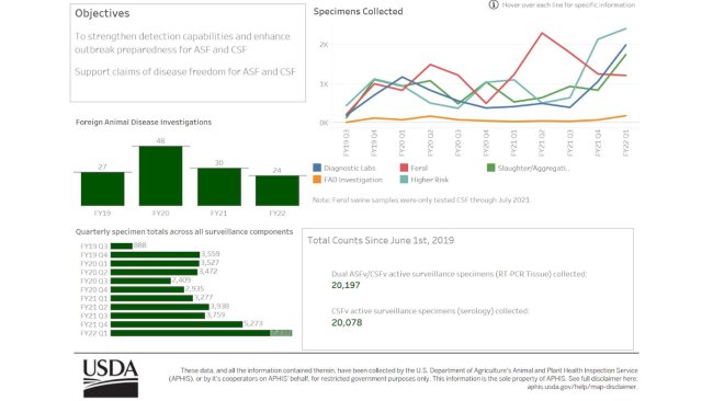 To strengthen detection capabilities and enhance outbreak preparedness for ASF and CSF, USDA has made a surveillance dashboard available.