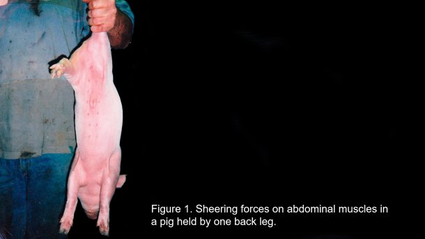 Furthermore, if the pig is lifted by the back leg and twisted to hold it across the operator’s body, damage can be done to the hip joint resulting in inflammation that entraps the sciatic nerve causing limb paralysis.