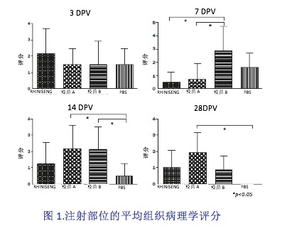 在 7 DPV 时,RHINISENG® 瑞立胜注射部位的组织病理学评分降低。但在疫苗 B 注射部位观察到的炎症程度高于 RHINISENG® 瑞立胜和疫苗 A 注射部位 (p<0.05)。在 14 DPV 时,疫苗 B 的评分略有降低,但疫苗 A 注射部位的评分升高。根据统计数字,两个部位的炎症程度均高于 PBS 注射部位 (p < 0.05)。在 28 DPV 时,RHINISENG® 瑞立胜注射部位的组织病理学损伤减少到最低,在疫苗 B 注射部位也得到了类似的结果。在疫苗 A 注射部位观察到轻度病变 (p < 0.05)。