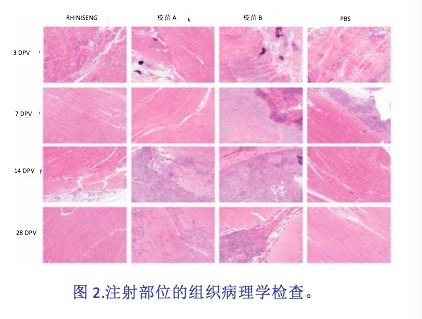 本研究中使用了 8 头 6 周龄的猪。随机选取年龄相近、健康状况正常的猪。将 6 周龄仔猪耳后的颈部肌肉平均分成四个区域,在其中肌内注射 2ml 三种不同的疫苗(RHINISENG®瑞立胜、疫苗 A、疫苗 B)和 PBS。将 8 头猪分成 4 组。接种疫苗后,在接种后 3 天 (DPV)、7 天(DPV)、14 天(DPV) 和 28天 (DPV)分别对每组的两头猪实施安乐死。根据肉眼和组织病理学发现评估局部反应。肉眼病变包括坏死、出血、脓肿、囊肿等异常病理检查所见。组织病理学评估分为四类:肉芽肿性炎症、中性粒细胞浸润、钙化、肌肉变性/坏死。每个类别的分级从 0(无明显病变)到 4(严重)不等。采用 Mann-Whitney 检验对平均组织病理学评分进行统计学分析。